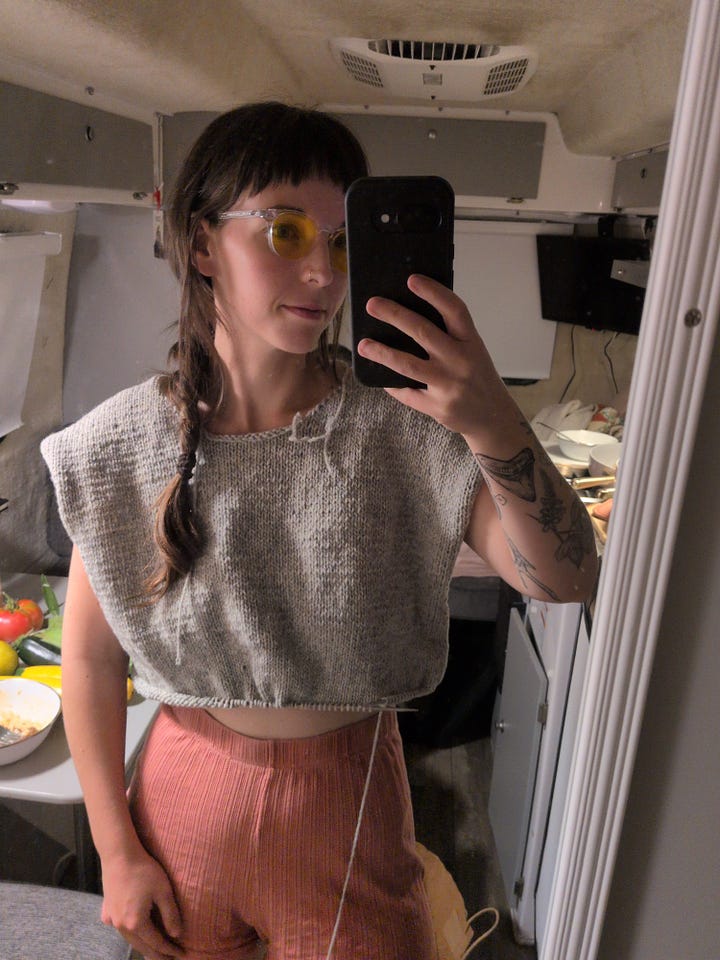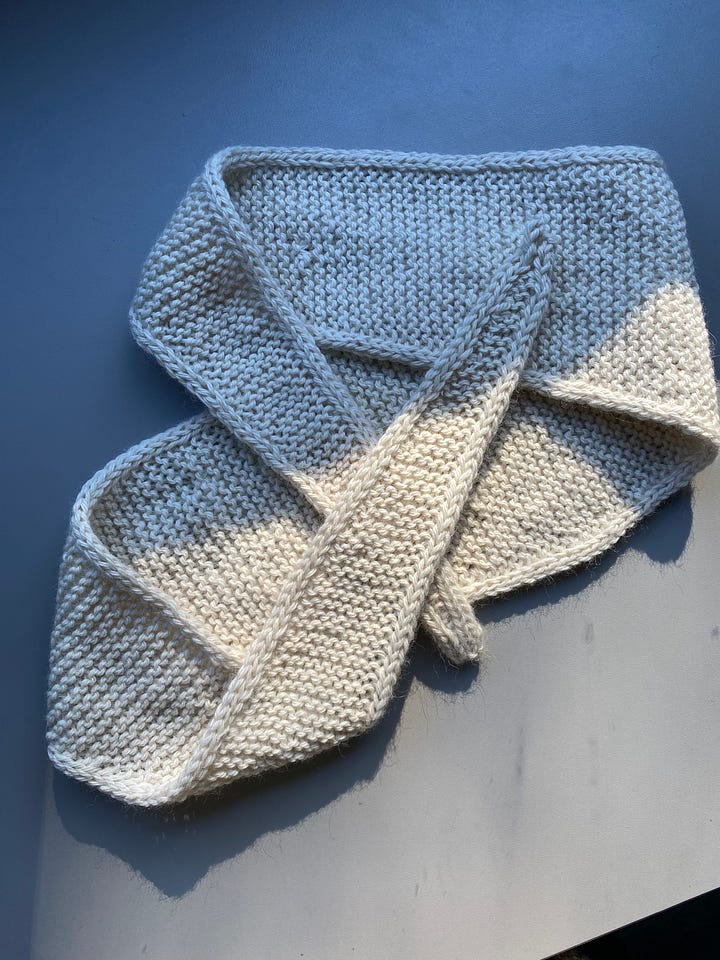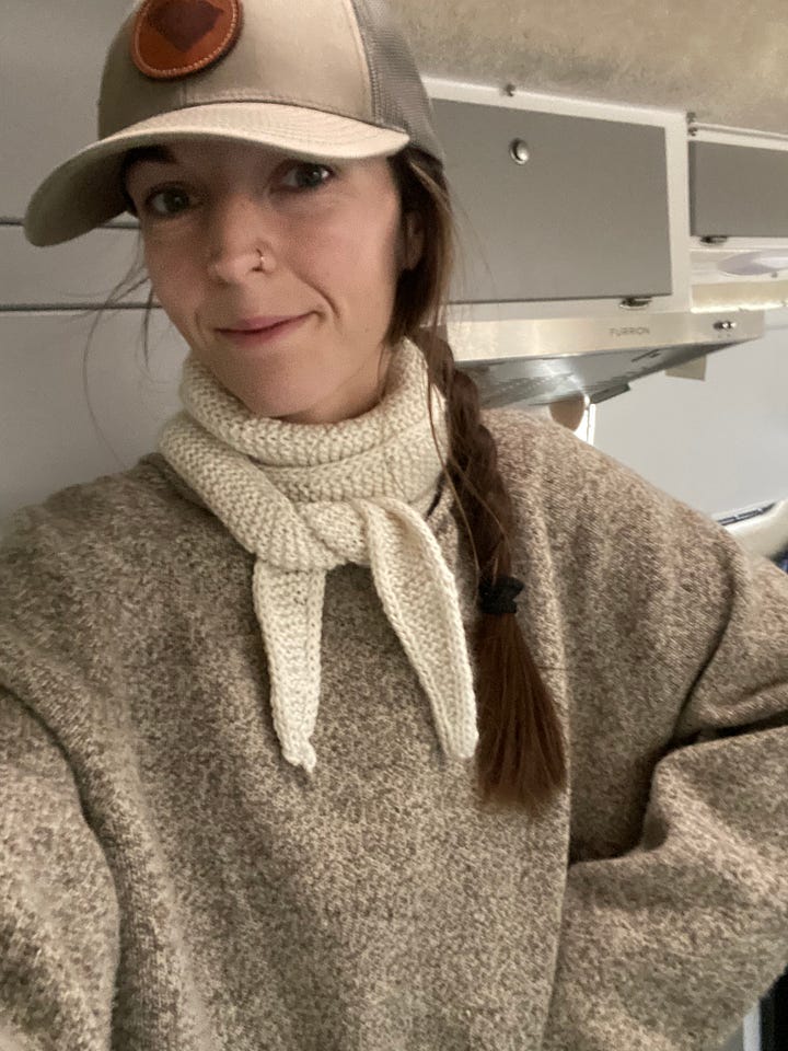 The materials sat and sat in my van, until we landed in Stowe, Vermont in the Fall of 2024. Something about the leaves changing and the chill in the air gave me that little extra push I needed to sit down and start learning again. And learn I did. There was a lot of trouble shooting, confusion, starting over, and asking for help from knitting friends both online and in real life. But I finished that first Sophie Scarf and have been slowly growing my skills with each new project ever since.
