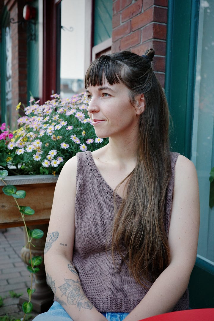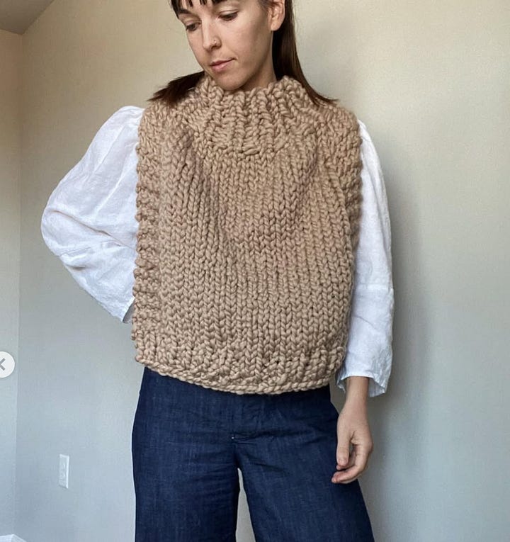 I’ve successfully completed two big projects that I’m really proud of: my Step by Step Sweater by Florence Miller and my Twofer Tank by Heidi Kirrmaier. Both of these projects were made easy by the fact that I walked into Ewe Fibers and the lovely women that run the shop picked out everything for me. The samples were hanging in the store so I could see what the finished garment would look like, the yarn was selected on my behalf based on their knowledge, and same for the needles. I knit gauge swatches for both projects and met gauge right away both times (if you’re asking what the heck is gauge - as was I - watch this video). Relying on those with experience and knowledge is my preferred way to learn. Going to local shops and having support to get started was how I learned to both sew and knit, plus a ton of youtube videos. P.S. there are an infinite amount of youtube videos on knitting, everything is clearly and thoroughly explained online you just have to look!