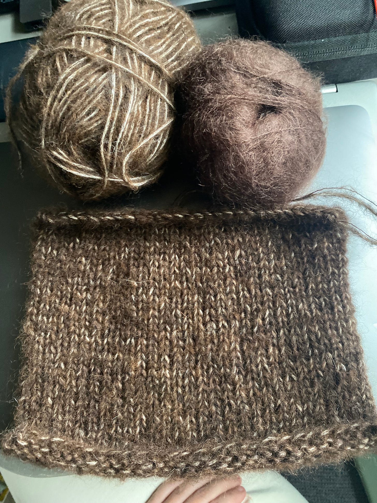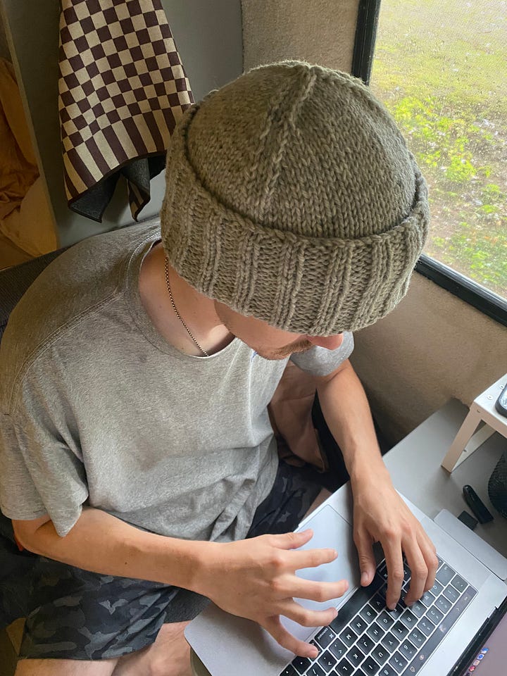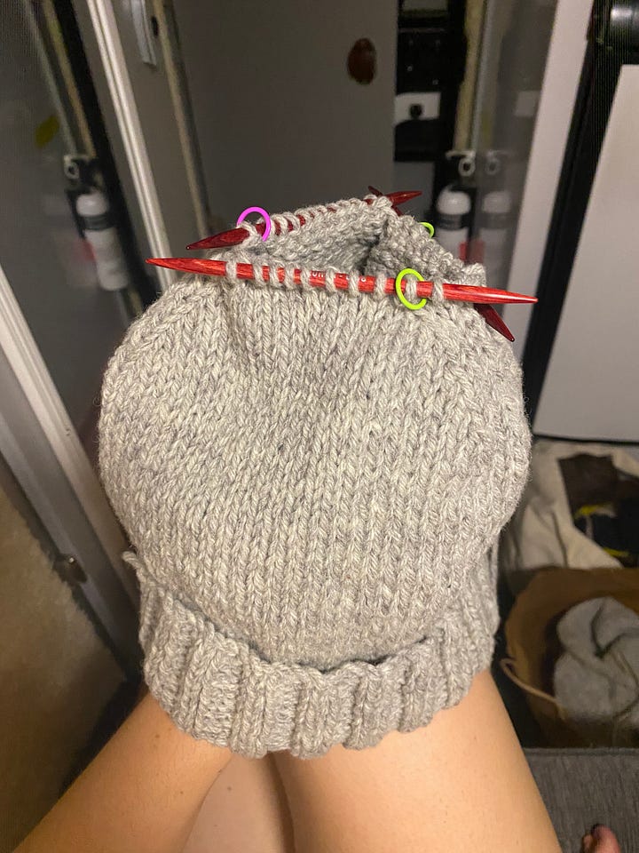 I actually bought this yarn thinking I’d make the cloud sweater, but after more research I realized that would not be a good idea. So with the extra yarn I bought I decided to work on a hat for my husband. I’m so glad I did because I learned how to use DPNs which were really intimidating (surprise, they’re not hard!), but again the gauge is off so the hat does not fit as intended and even though he loves it I think it looks a bit silly. It looks homemade, but not in a good way lol. I want to try again and am in a toss up between a) sizing down a needle size or b) adjusting the measurements of the hat to compensate (i.e. 3.5” of ribbing and 3” of the hat body before decreases instead of the written 4.5” and 4” respectively).
